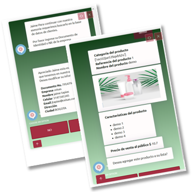 Mediante el Asesor Comercial Virtual sus clientes pueden realizar consultas de productos, realizar cotizaciones, elaborar ordenes de pedido sin necesidad de un vendedor, además de poder ingresar sus PQRS para ser atendidas de forma inmediata por sus asesores de servicio.